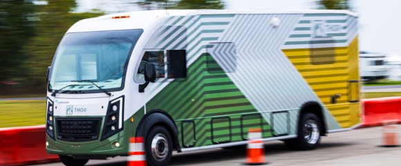 New motorhome from THOR and Harbinger delivers a 500-mile range using a low-emissions gasoline range extender to recharge the batteries.